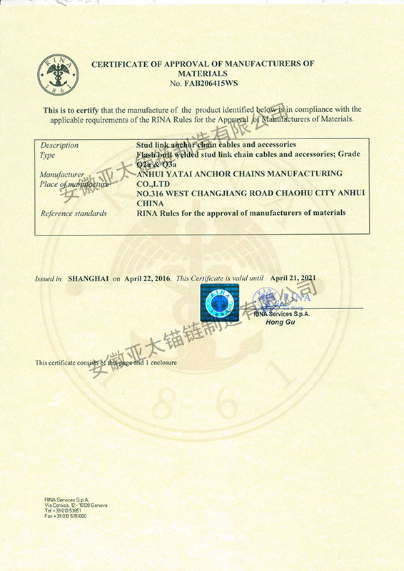 安徽亞太錨鏈制造有限公司是國家高新技術(shù)企業(yè),也是國家GB/T 549-2017《電焊錨鏈》標(biāo)準(zhǔn)的起草和制定單位之一。公司旗下設(shè)有錨鏈分廠、浮標(biāo)分廠、舾裝件分廠等多個分廠。公司專業(yè)從事φ12.5mm-φ107mm二、三級船用錨鏈、浮標(biāo)錨鏈、錨鏈附件,錨、船舶曬裝產(chǎn)品、航標(biāo)、系船浮、船型標(biāo)、多種規(guī)格海洋監(jiān)測浮標(biāo)及航標(biāo)燈等產(chǎn)品的生產(chǎn)、安裝和服務(wù)。目前公司的產(chǎn)品銷往全國各地船廠、碼頭、航標(biāo)處、航道局、海洋局,并已走上國際市場,如東南亞、中東、歐美等國家。